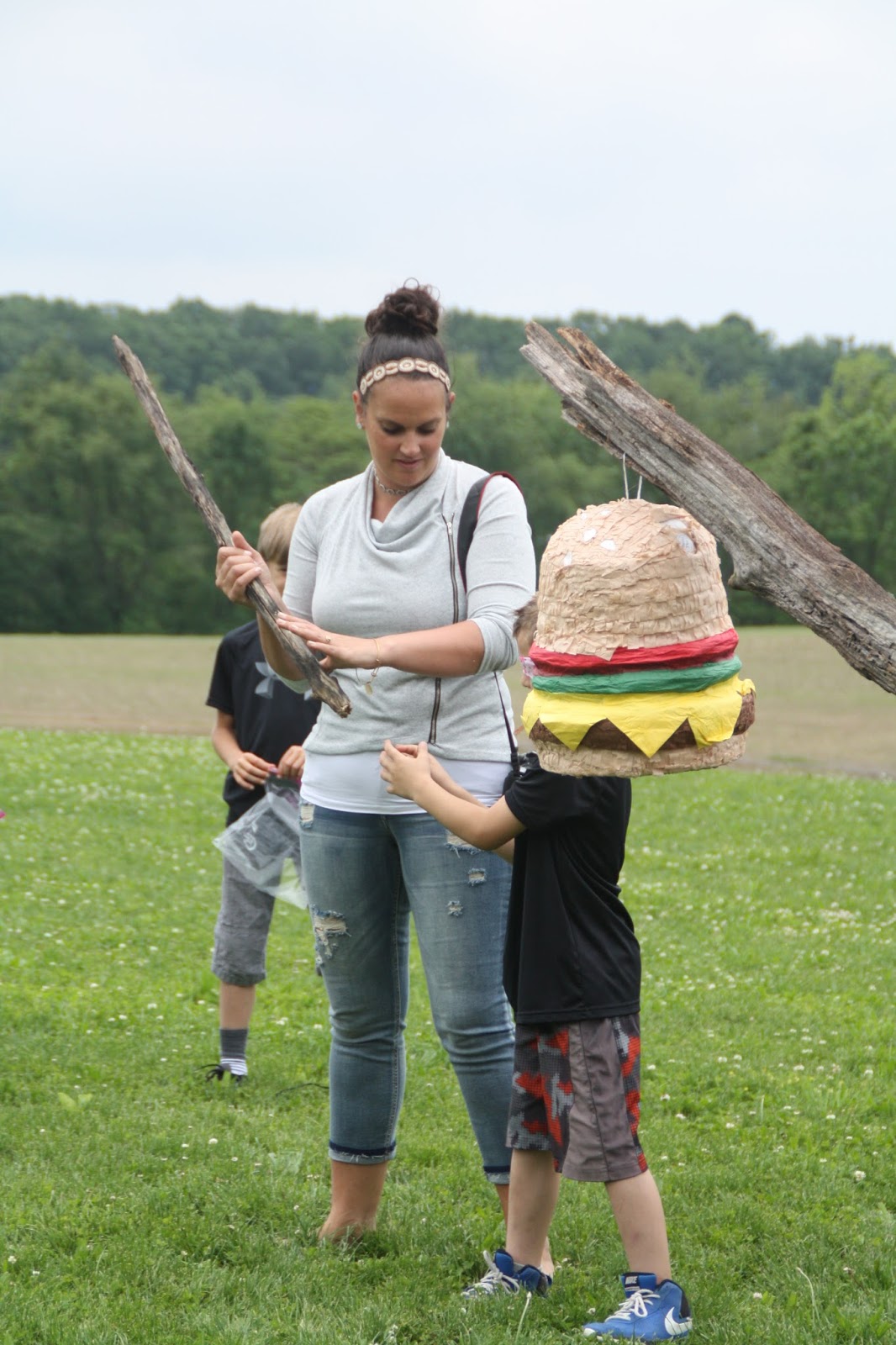 Martha Rose always gets something together for the children.  We all hike up the wooded trail and when we reach the top of the hill, there's a sand volleyball, swing set and a large grassy area to play!  This is where John and Martha did their best to hang a pinata filled with candy!!!  :)))